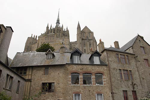 προστατεύεται από τα στοιχεία της φύσεως και συνεπώς αποτελεί τέλειο καταφύγιο για οποιονδήποτε θα μπορούσε να τον προσεγγίσει. Η ειρήνη που βασίλευε στο νησί ήταν ιδανική για προσήλωση στα θεϊκά μυστήρια.Τμήμα του αβαείου καταστράφηκε από πυρκαγιά το 1204 και αντικαταστάθηκε από το περίφημο κτίριο που είναι γνωστό σαν Λα Μερβέιγ (το Θαύμα). Διαθέτει 3 ορόφους, διαιρείται σε δύο παρακείμενα τμήματα και βλέπει τη θάλασσα προς βορρά της εκκλησίας. Ο πιο χαμηλός από τους 3 ορόφους, το ισόγειο, ήταν εκείνος όπου βρισκόταν η αποθήκη τροφίμων και η τραπεζαρία για τους προσκυνητές. Στον πρώτο όροφο υπήρχε η τραπεζαρία για τους επισκέπτες με καλή κοινωνική θέση και το γραφείο της μονής, που αργότερα ονομάστηκε «Αίθουσα των Ιπποτών» και στο οποίο οι μοναχοί παρήγαγαν τους φωτισμένους κώδικές τους. Στον τελευταίο όροφο, η τραπεζαρία των μοναχών συνδεόταν με τη μονή που περιλάμβανε έναν κρεμαστό κήπο, ο οποίος περιβαλλόταν από τοξωτές στοές που στηρίζονταν σε κίονες διακοσμημένους με θέματα από άνθη. Ο συμβολισμός της αρχιτεκτονικής παράστασης είναι ξεκάθαρος. Οι 3 όροφοι αντιστοιχούν στα τρία επίπεδα του ανθρώπου: Το κατώτερο αναφέρεται στις υλικές ενασχολήσεις, το μεσαίο στην πολυμάθεια και το ανώτερο σημαίνει επικοινωνία με τον Θεό.
